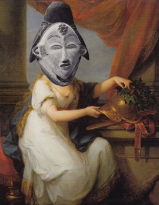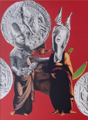 Sulter passionately believed in the long-intertwined histories of Africa and Europe, contesting the notion that the black presence in the UK was a recent arrival. Her photomontage Twa Blak Wimmin (1997) was inspired by historical accounts of ‘Blak Margaret’ and ‘Blak Elene’ who were feted at the court of King James IV of Scotland in the early 16th century. Syrcas (1993), a major work that was chosen to represent Britain at the first Johannesburg Biennale, combines vintage postcards of Alpine landscapes, illustrations from publications on African art, and images of European art and photography. Ostensibly pages from a scrapbook made by ‘Helga’, a fictitious girl of Cameroonian descent whose parents are killed in the Third Reich, Syrcas links the horrors of African slavery with the European persecution of minorities in the 1930s and 1940s. This is the first time in over 20 years that these 16 large-scale images will be shown in their entirety as a set.
